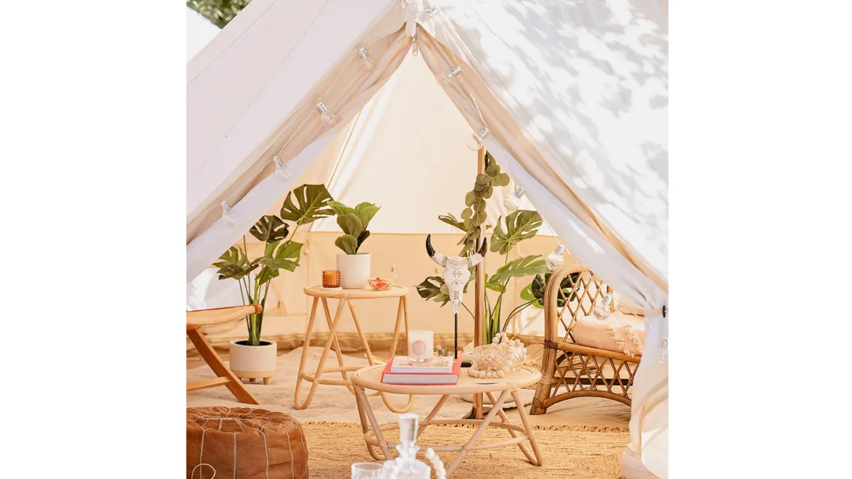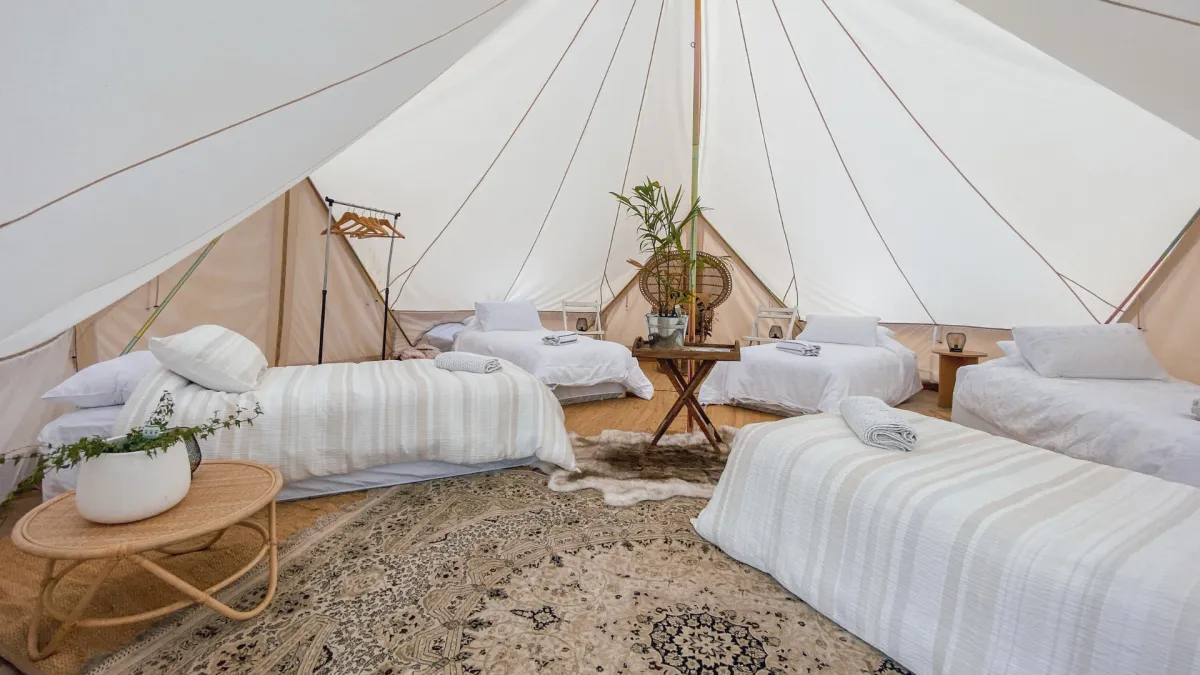 Think open skies, soft linen beds inside cozy glamping tents, candlelit corners, and the gentle hum of the wild around you.